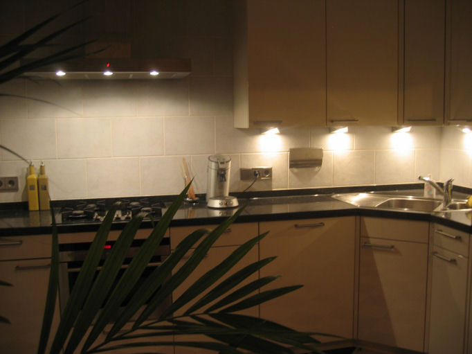 ingerichte open keuken met inbouwapparatuur, luxe badkamer, 2 TV's,